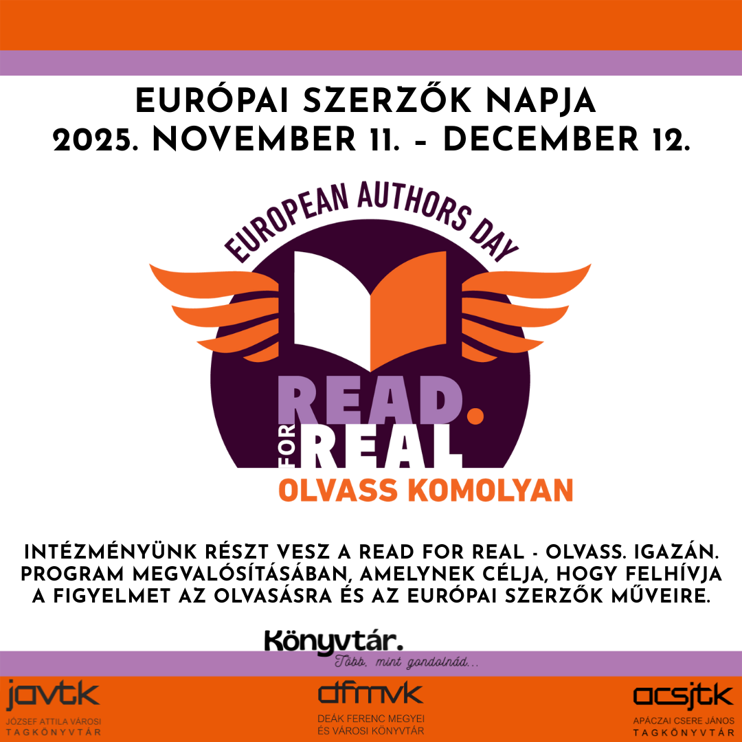 A Magyar Olvasástársaság (HUNRA) az EURead kezdeményezés tagszervezeteként részt vesz a Read for Real - Olvass! Igazán. program megvalósításában, amelynek célja, hogy felhívja a figyelmet az Európai Szerzők Napjára.